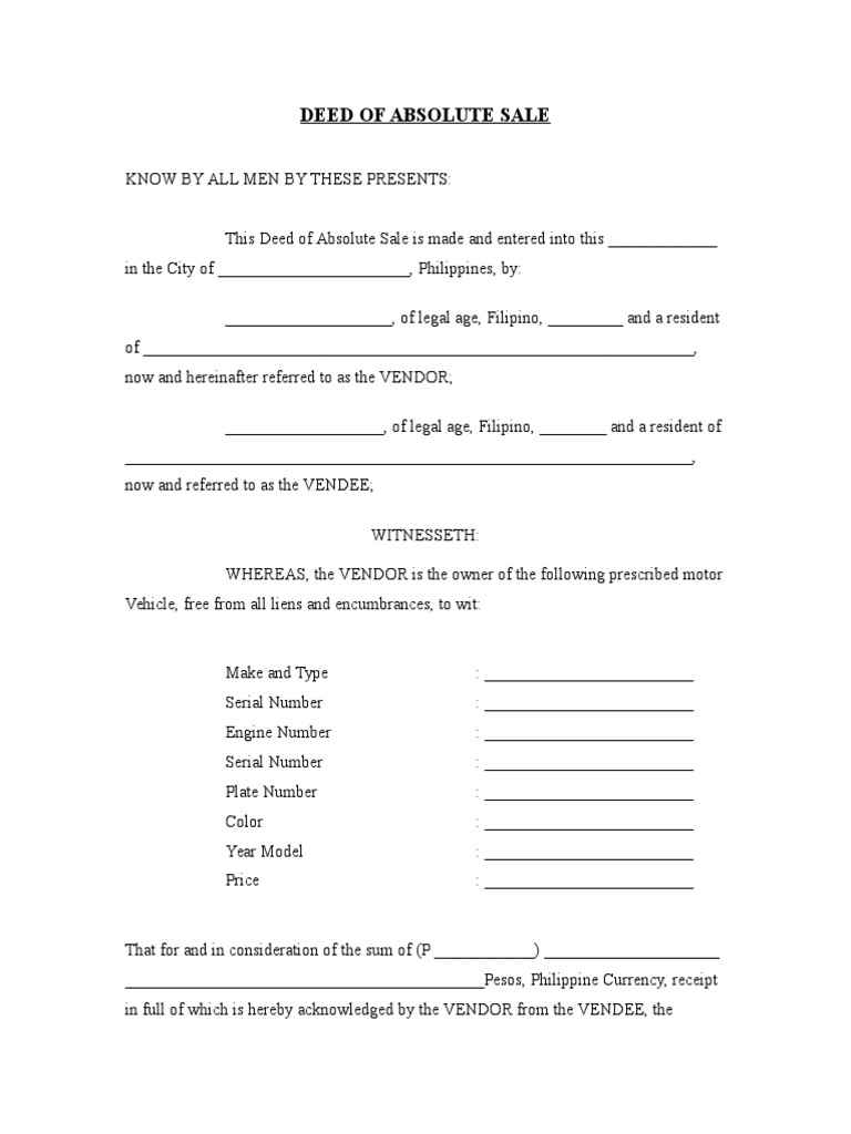 Philippines Deed Of Sale Of Motor Vehicle Form Download Printable PDF | Templateroller